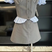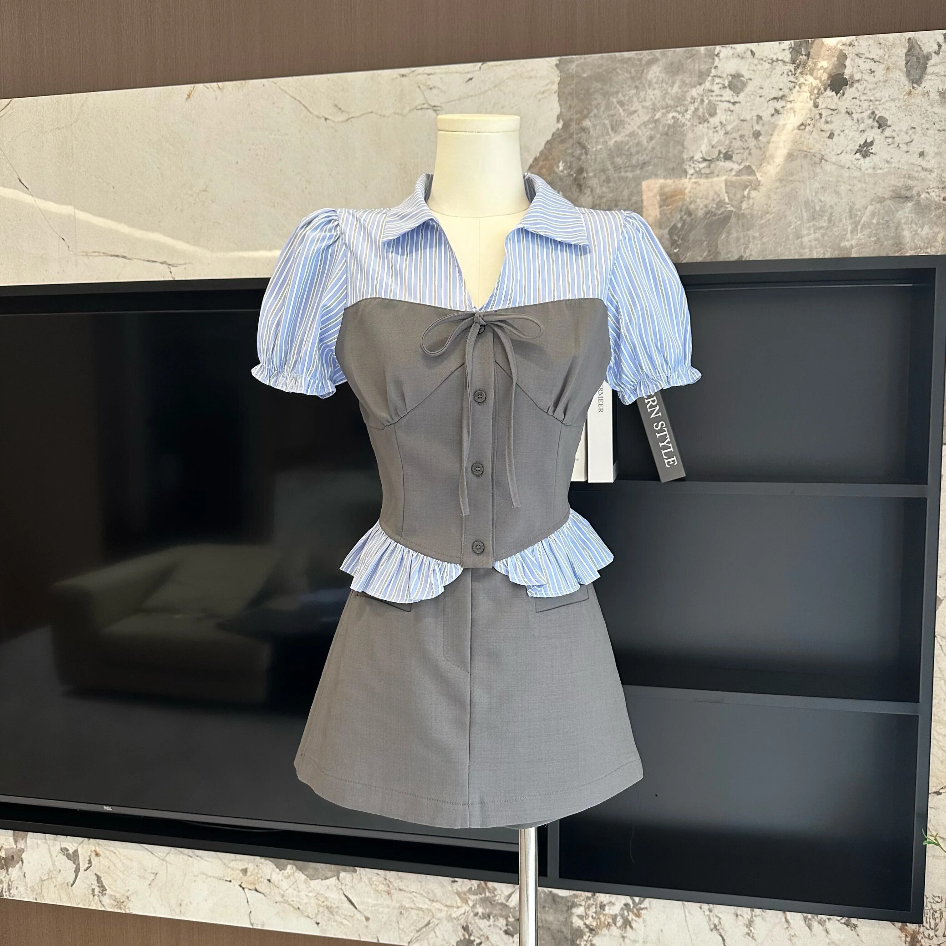 甘いカレッジスタイルスーツ夏 V ネックシャツハイウエストミニスカート 2 点セットファッション ハイウェスト 大人ガーリー スウィート キュート カジュアル サマー 夏物 Vネック