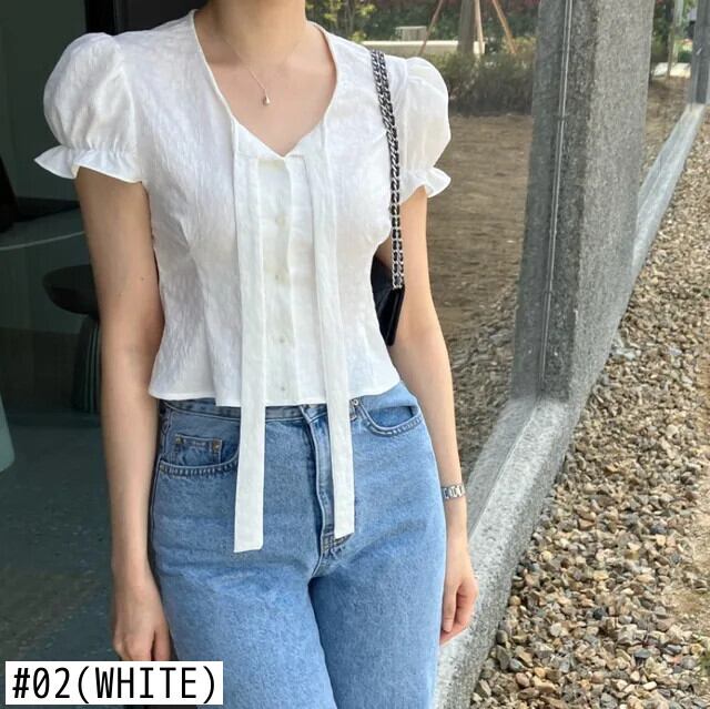 甘いホットガールジャカードリボンシングルブレストシャツ夏スリムフィットバブルスリーブショートシャツ 大人ガーリー スウィート キュート カジュアル サマー 夏物