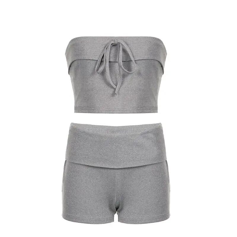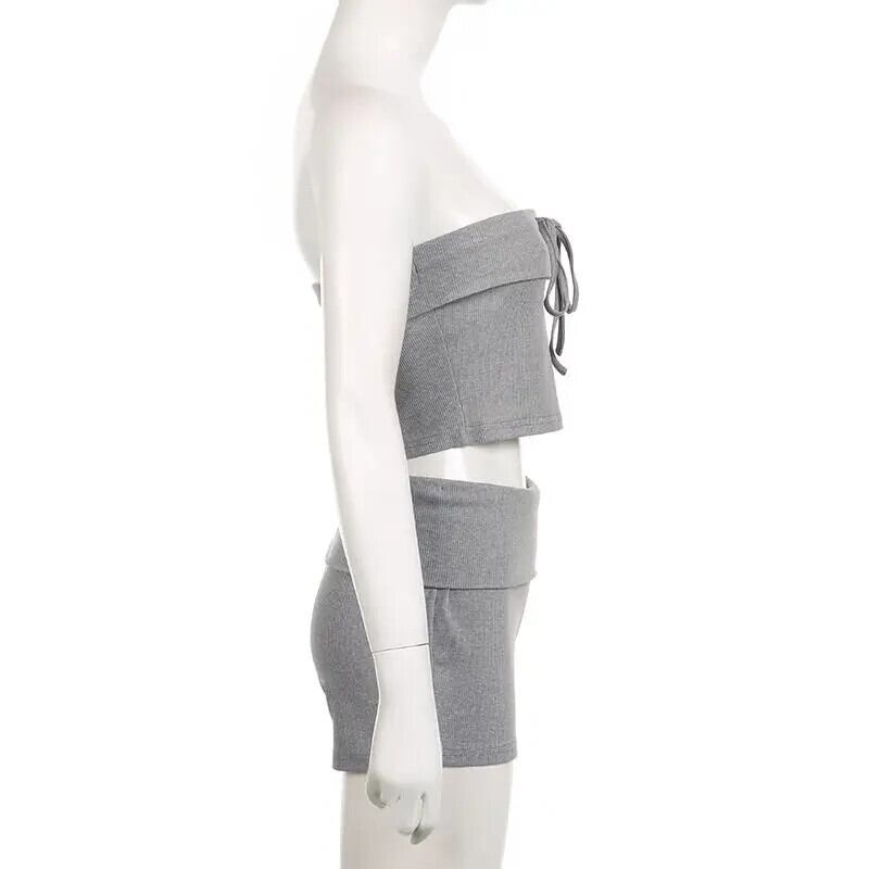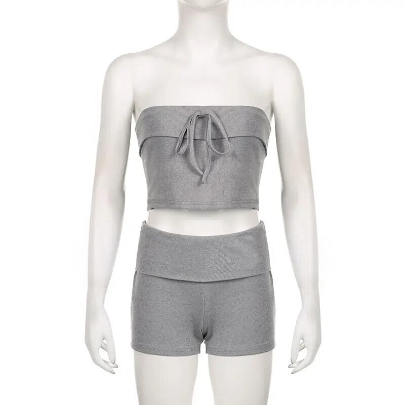 アメリカンホットガールスーツ夏スリムフィットリブストラップレスレースアップベストショーツツーピースセット サマー 夏物 ブルマー