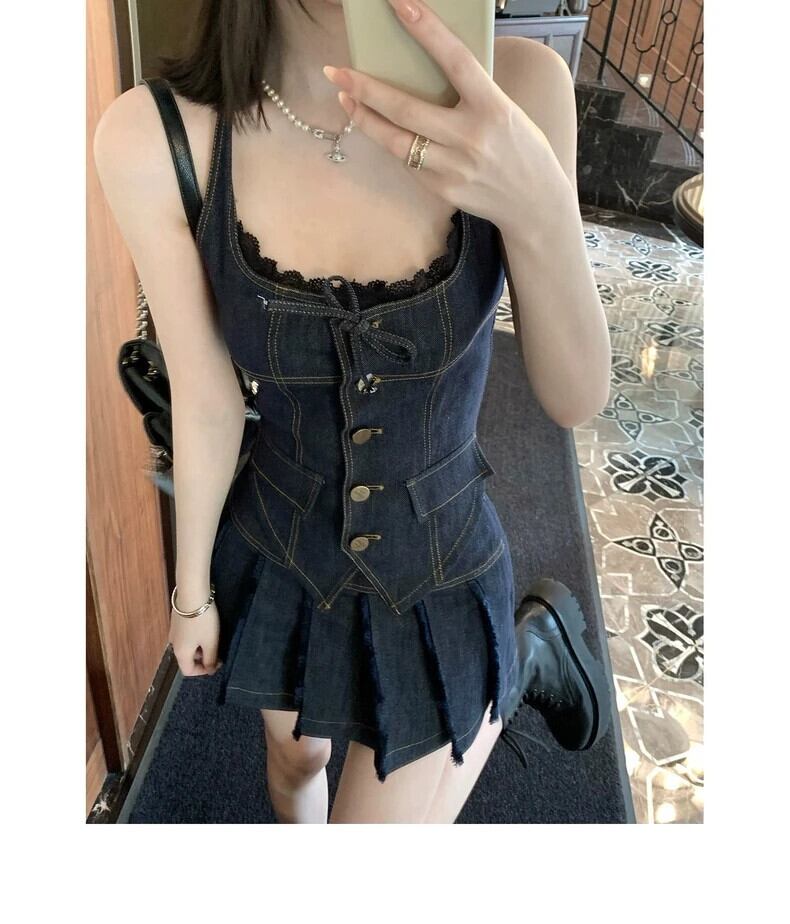 スイートホットガールデニムスーツ夏スクエアカラーノースリーブスリムフィットトップウエスト A ラインスカート 2 点セット 大人ガーリー スウィート キュート カジュアル サマー 夏物 Aライン スクウェア