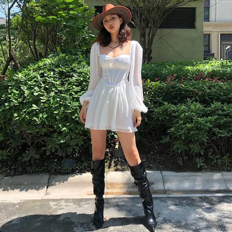 フレンチホットガールレトロホワイトランタンスリーブドレスウエストタイスクエアカラーショートAラインドレス スクウェア