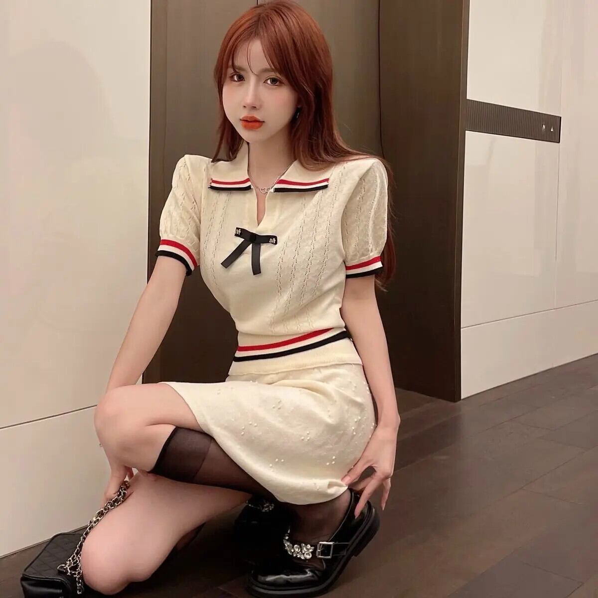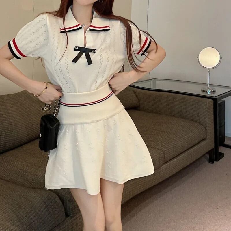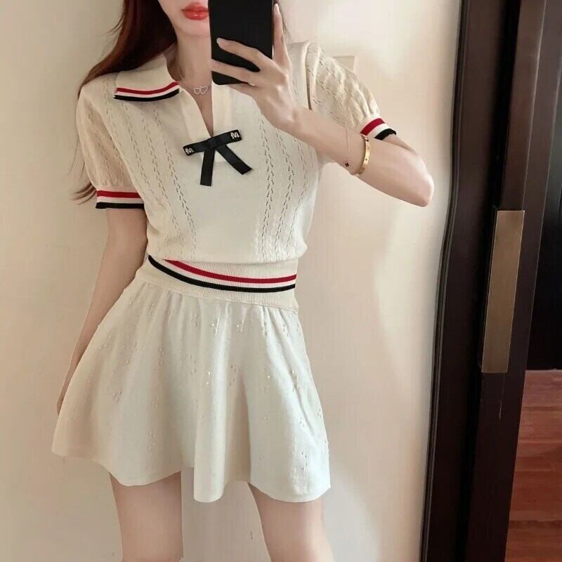 甘いホットガールボウスーツ夏半袖ニットシャツ A ラインミニスカート 2 点セット リボン 大人ガーリー スウィート キュート カジュアル サマー 夏物 Aライン