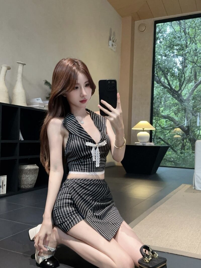 甘いホットガールスーツ夏ストライプバックレスノースリーブトップ不規則ヒップラップショートスカートツーピースセット 大人ガーリー スウィート キュート カジュアル サマー 夏物