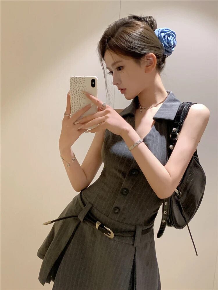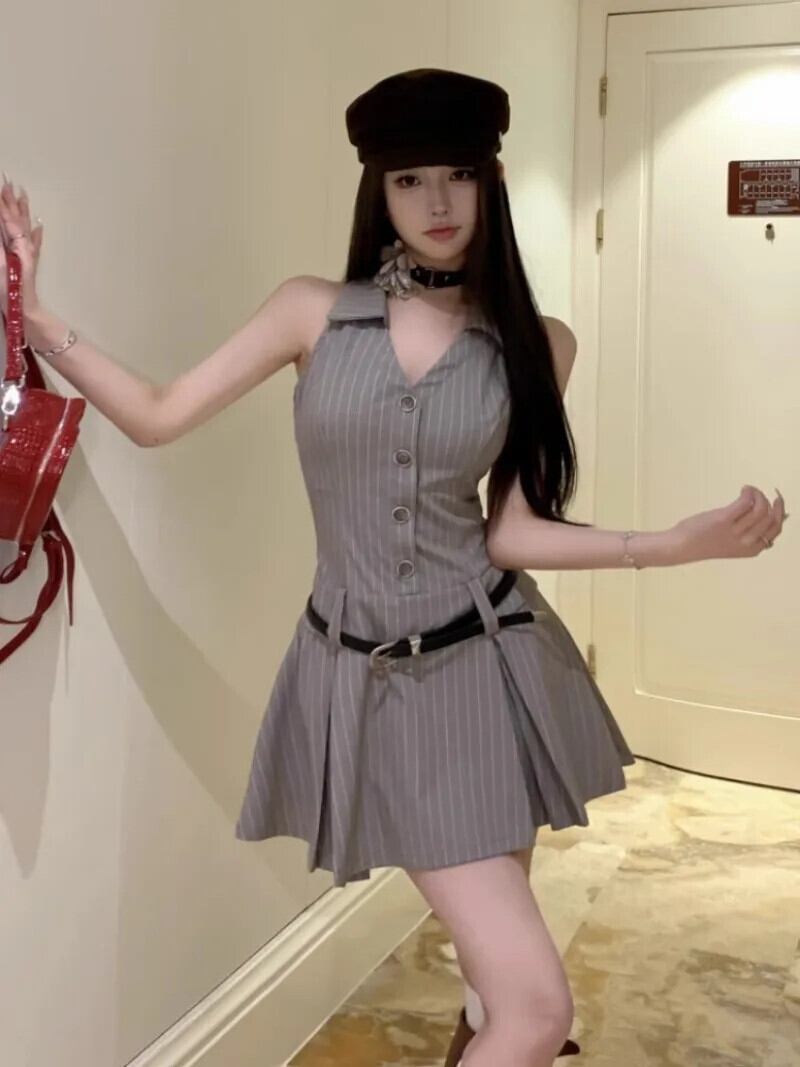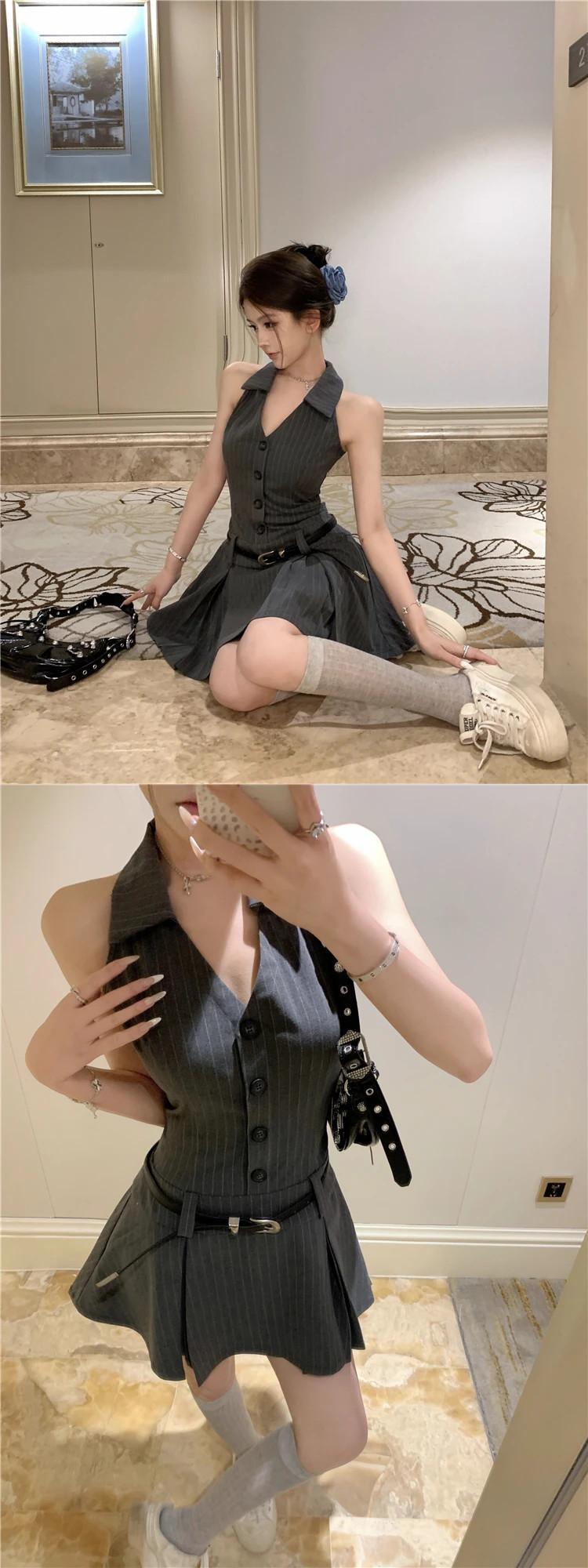 ホットガールスタイルレトログレーホルターネックドレス夏ノースリーブウエストショートプリーツドレス サマー 夏物