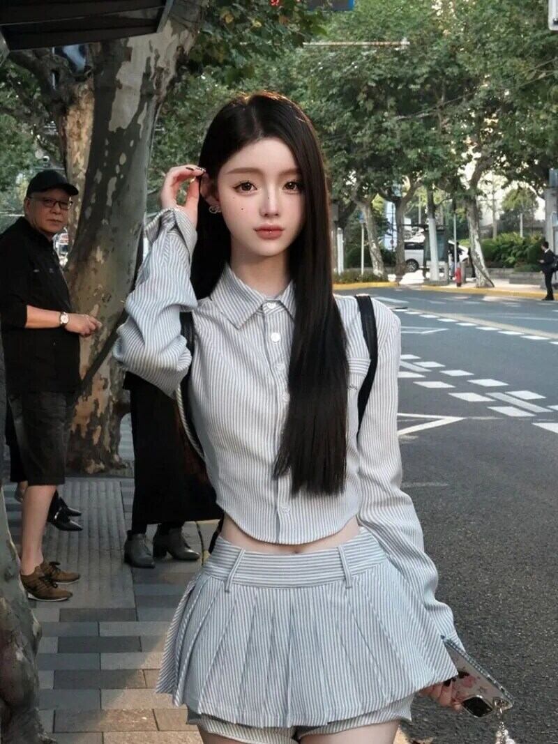 甘いホットガールガールズプレッピースタイルスーツ夏ストライプ長袖シャツトップウエストプリーツスカート 2 点セット ロング 大人ガーリー スウィート キュート カジュアル サマー 夏物