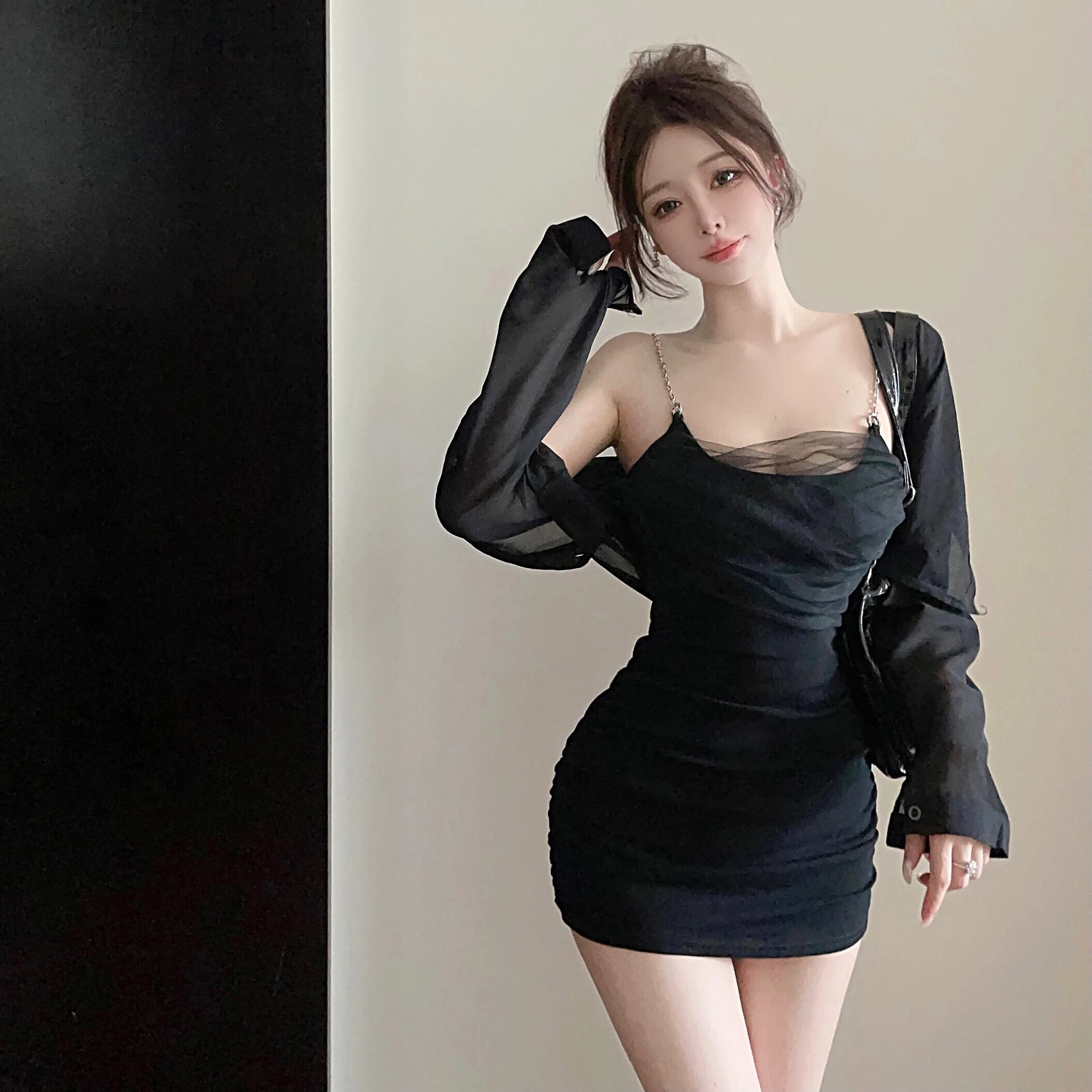 甘いホットガールスーツ夏長袖シャツジャケットチェーンメッシュパッチワークストラップドレス 2 点セット ロング 大人ガーリー スウィート キュート カジュアル サマー 夏物