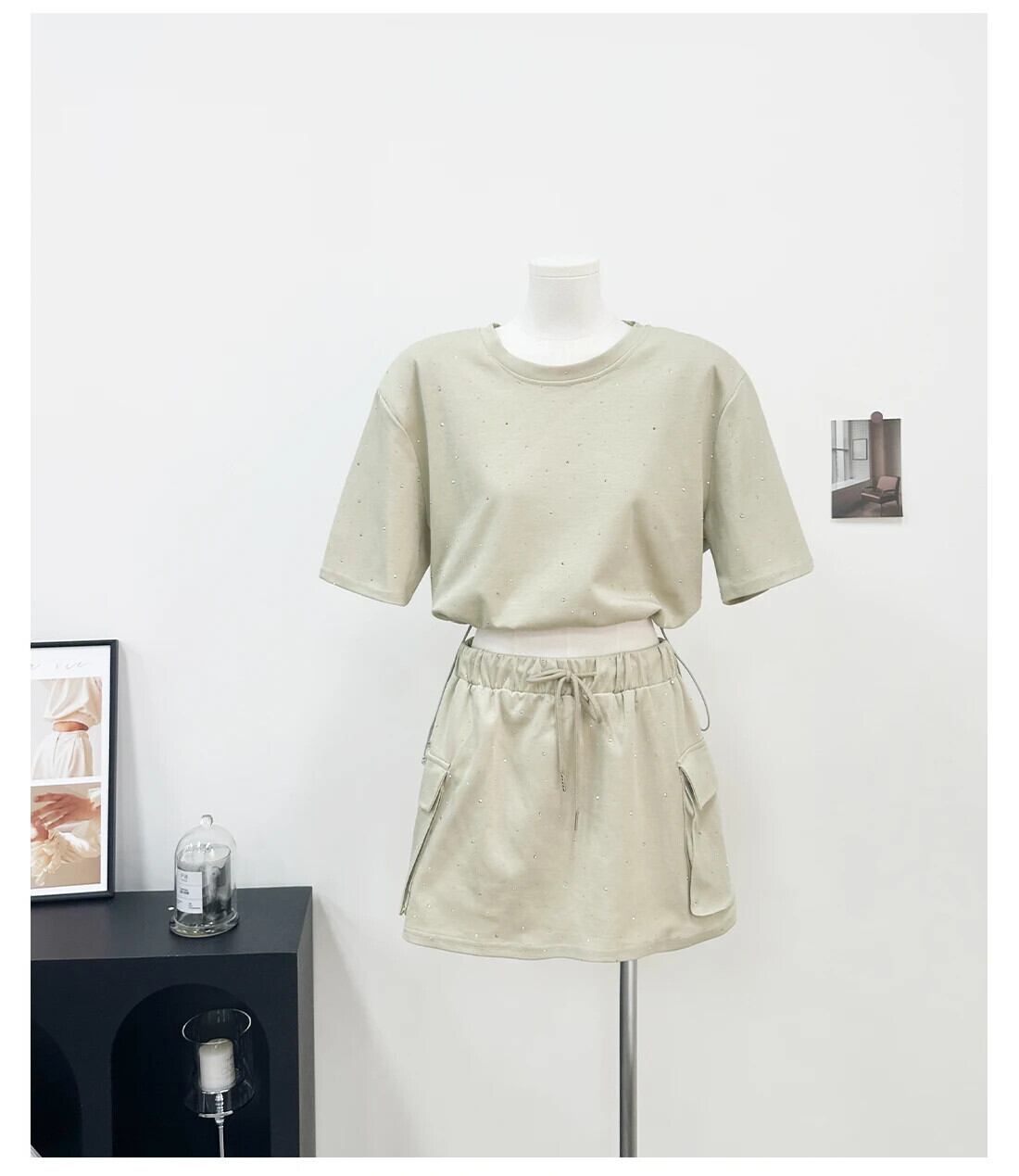 甘いホットガールスーツ夏ラインストーン半袖 Tシャツウエスト A ラインスカート 2 点セット 大人ガーリー スウィート キュート カジュアル サマー 夏物 Aライン