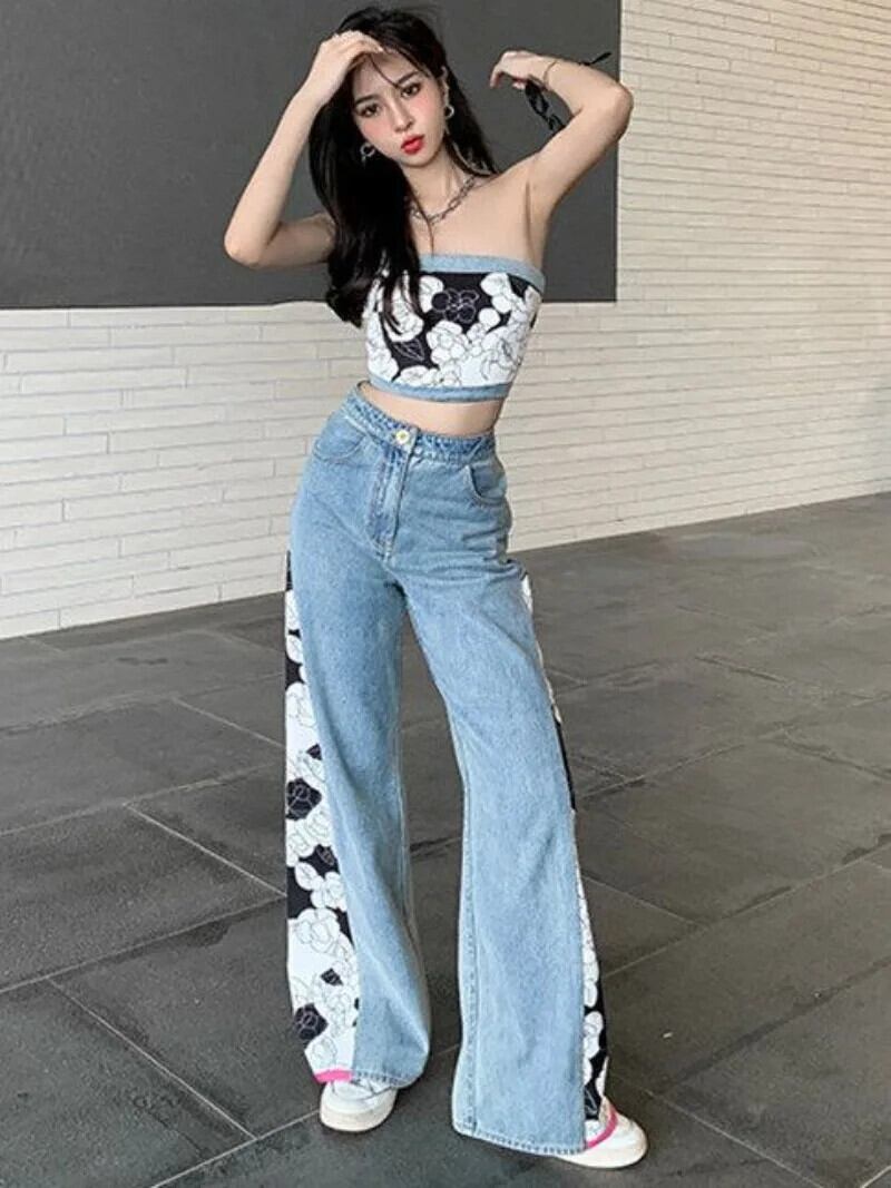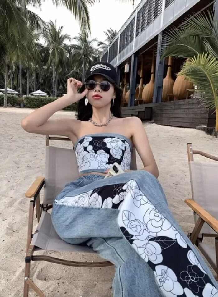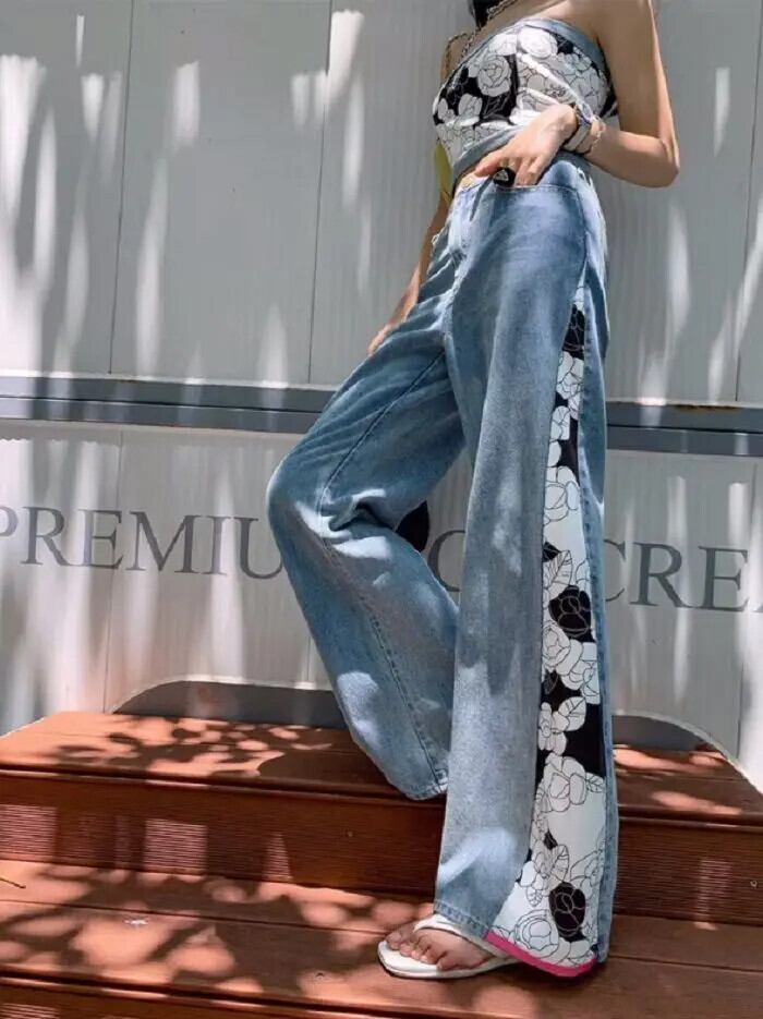 甘いホットガールデニムスーツ夏プリントショートストラップレストップワイドレッグロングパンツツーピースセット 大人ガーリー スウィート キュート カジュアル サマー 夏物 ワイドパンツ